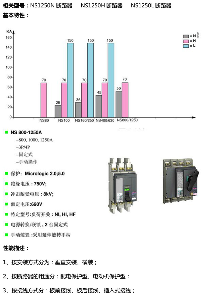 塑殼斷路器NS系列塑殼式斷路器。其設計體現了限流原理和制造技術,是有結構好、全模塊化等特點。適用于交流690V,頻率50-60Hz,額定電流12.5A~1600A的電力線路中短路和過載保護之用。額定絕緣電壓達690V在正常情況下作不頻繁的閉合或斷開之用,也可作鼠籠式電動機的不頻繁起動,運轉中中斷、過載以及在電動機,短路及欠電壓時起保護之用。